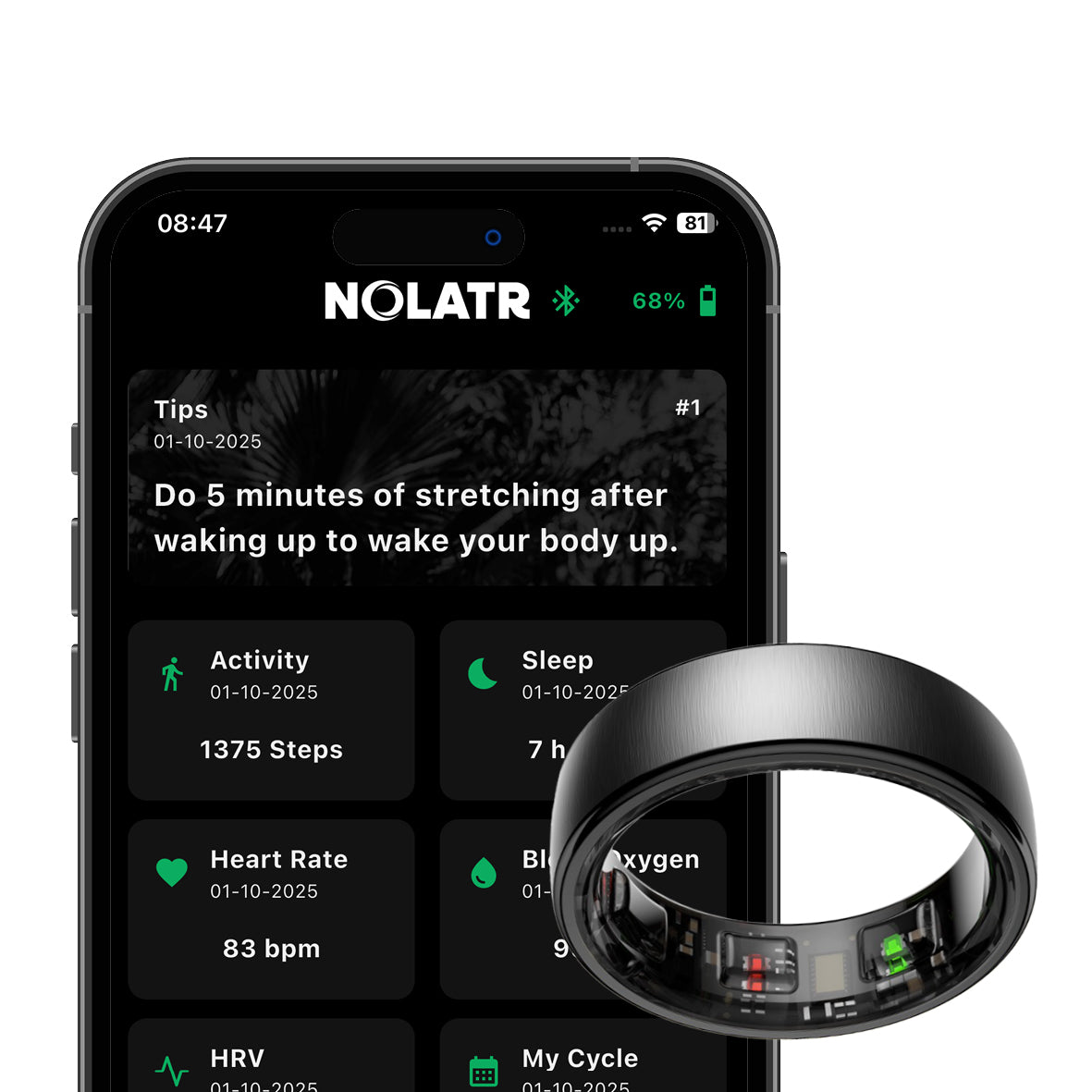 The NOLATR app is a perfect way to track your health and activity data collected by your CORE ring. The NOLATR app shows all your vital information, from sleep patterns to fitness levels (steps, calories, distance), ensuring your data is always up to date.